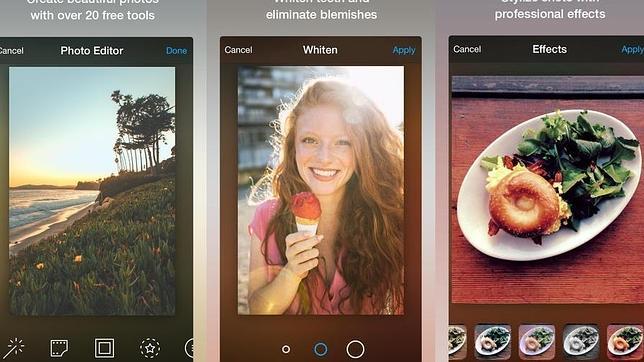 Este es uno de los mejores y más extendidos entre los usuarios editores fotográficos que se pueden encontrar en las principales tiendas de aplicaciones. Disponible para iOS y Android, esta herramienta tiene una interfaz muy intuitiva y ofrece hasta 12 tipos de efectos para modificar las imágenes. Se puede recortar las fotografías, regular el balance, el brillo, el contraste y la saturación. Además, ofrece la posibilidad de dibujar textos así como utilizar servicios como corrector de ojos rojos o blanquear dientes.