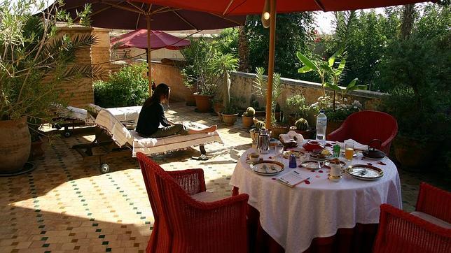 Los riads son antiguos palacetes árabes con patio interior. En el centro del patio una fuente, alrededor de la fuente un coro de plantas, en la azotea un atardecer inolvidable. La música del agua relaja y el aroma de las buganvillas alegra. Todo esta en calma, el mundo puede seguir girando al ritmo que se le antoje porque aquí dentro el tiempo se ha detenido.