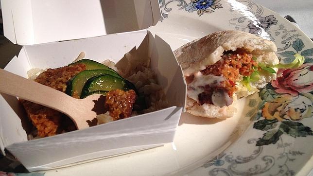 Hamburguesa de tomate y curry con arroz integral y calabacines