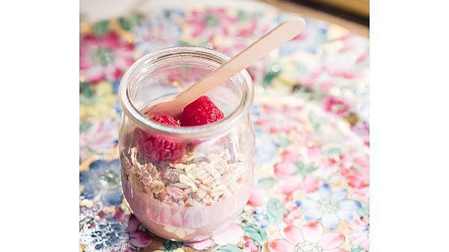 Yogurt de frambuesas y soja con muesli, frambuesa y agave
