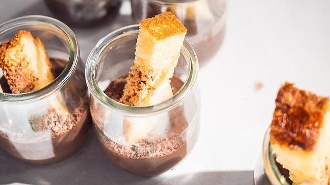 -En un cuenquito incluimos la crema del postre de chocolate y decoramos con las virutas.