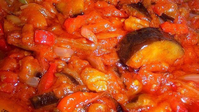 Receta:Pelamos los tomates y los freímos en aceite y sal. Cuando estén pochados los reservamos. Picamos la cebolla muy fina, rehogamos y reservamos. Cortamos en dados los pimientos y las berenjenas y los rehogamos por separado.