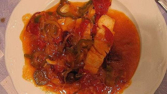 Receta:Tras haber tenido el bacalao a remojo durante 24 horas, le quitamos la piel y lo troceamos. Ponerlo al fuego durante unos cinco minutos en una cazuela con agua hirviendo; entonces, sacarlo y secarlo con un paño; pasarlo por harina ligeramente y freírlo por ambos lados. Aparte, preparamos un majado con ajos y laurel fritos al que agregamos el aceite, pimentón y un vaso de vinagre.