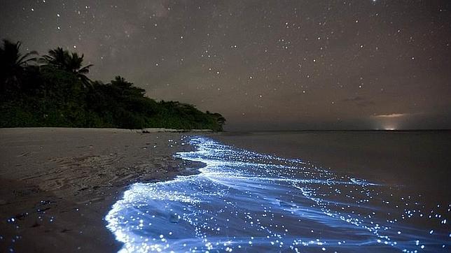 Playa de Vaadhoo Un curioso efecto de la naturaleza tiene lugar en esta playa de las Islas Galápagos, cuando los organismos microscópicos llamados fitoplancton bioluminiscente convierten las aguas en un reflejo del cielo nocturno.