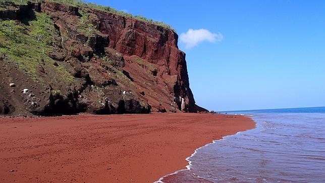 Red Sand Beach En la isla de Rábida, en el archipiélago de las Galápagos, hay una playa muy especial con una arena de color rojizo, gracias al alto contenido en hierro de la lava.