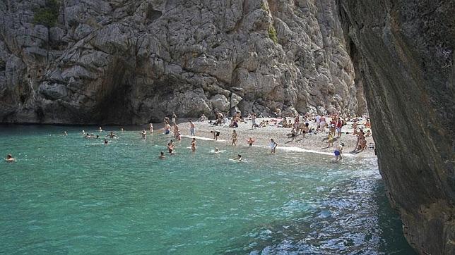 platges de balears Una cala entre acantilados gigantes. Sa Calobra está a 38 kilómetros de Sóller, entre Morro de sa Vaca y Morro de ses Fel·les, bajo la sombra de Puig Major (1.445 metros de altitud), la cima más alta de las islas Baleares. El reclamo de esta playa de arena, grava y cantos rodados se encuentra tras el túnel peatonal que bordea los acantilados verticales y agrestes, dando acceso a la bellísima y paradisíaca desembocadura del Torrent de Pareis, fuente de inspiración de artistas y donde cada verano se realiza un concierto coral gracias a su acústica excelente. La carretera de acceso añade encanto a esta playa: son 14 kilómetros de curvas -12 de 180 grados y una de 360-, conocida como Nus de sa Corbata (Nudo de la corbata).