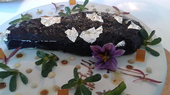 Precisamente uno de los mejores platos que hemos tomado este año es la berenjena frita. Una berenjena a la brasa recubierta por una falsa piel de patata bajo la que aparece la hortaliza muy cremosa, con gran sabor. Pequeños restos de papel de plata para simular las que se hacen así envueltas en las brasas. Alrededor, en esos juegos estéticos que tanto gustan en Dos Cielos, diversas salsa en coloridos puntitos, desde un alioli hasta una vinagreta, daditos de amaretto, brotes de cilantro... Todo contribuye a realzar el plato.
