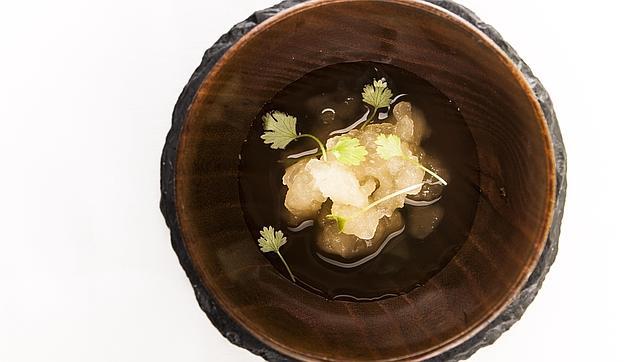 Casi todos los platos del menú de León están a gran nivel. Por ejemplo ese arroz con placton que ya viene de años anteriores y que puede pasar perfectamente a la historia de la cocina. Sin embargo, entre tantas grandes elaboraciones, este año nos quedamos con la espectacular infusión de mojama de Barbate con agua de tomate, una especie de dashi japonés pero en frío. Exaltación del sabor bajo una aparente, sólo aparente, sencillez.