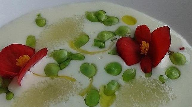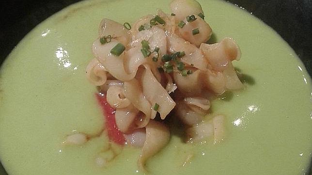 Crema fría de guisantes de Llavaneras con menta, fideos de calamar de potera, tomate seco y curry. Santceloni