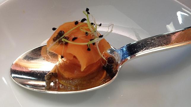 Entre todos los grandes platos de 2014 en Atrio sobresale el excepcional ravioli de zanahoria relleno de ortiguilla de mar y caviar, con un caldo de zanahoria e hinojo. Maravillosa combinación. Frescura, yodo marino, toques salinos, sabor… Una elaboración que por sí sola hubiera justificado el viaje a Cáceres.