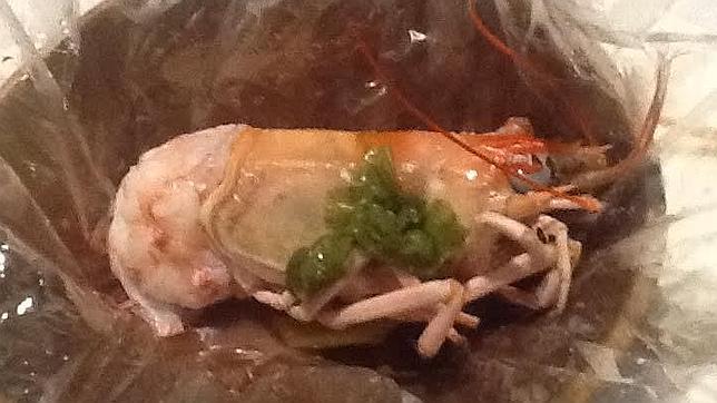La gamba roja nunca falla en los menús de El Celler de Can Roca, pero de cuantas versiones han hecho con ellas, que han sido muchas, esta gamba con vinagre, que forma parte del último menú del año, es sin duda la mejor. El cuerpo marinado en vinagre de arroz. Al lado, el jugo de la cabeza, las patas crujientes y una velouté de gamba. Fantástica.
