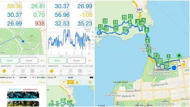 Road Bike Pro de Runtastic. Una app para Android y Apple que aporta un torrente de información que incluso puede resultar excesiva para los que solo pedalean de vez en cuando: seguimiento GPS, medición de distancia, duración, velocidad, calorías quemadas, tablas de velocidad, desniveles y ritmo cardíaco, reproductor de música integrado, historial de entrenamiento, clima, todo tipo de mapas... La versión de pago cuesta 4,99 euros, aunque hay una gratis más básica y recomendable, al menos para empezar.
