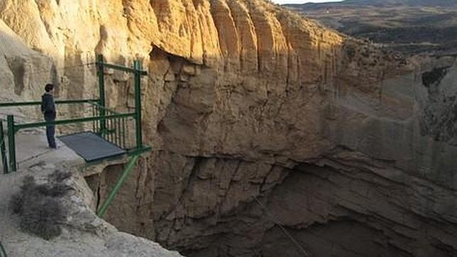 La sima de San Pedro debió ser durante siglos un lugar inquietante, amenazador, un pozo sin fondo al que las piedras tardan varios segundos en llegar. Desde la pasarela hasta el fondo del lago hay unos 107 metros, lo que da idea de sus dimensiones, de su espectacularidad. Por su valor geológico, se la considera única en Europa. Y por sus condiciones, se la utiliza a menudo para realizar competiciones nacionales e internacionales de espeleología. Un descenso hasta su corazón es una de las aventuras más vertiginosas que aún podemos acometer. El fondo de esta espectacular boca lo ocupa un lago de veintidós metros de altura y unos 560.000 m3 de agua. Los niños que se acercan hasta la pasarela/mirador prueban la caída con algún que otro guijarro y con el clásico grito del eco. Alrededor, silencio, el cielo azul, los riscos, escenarios solitarios perfectos para rodar un videoclip.