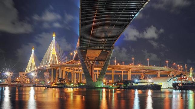 El Puente Bhumibol, también conocido como Ring Road Bridge, es parte de los 13 kilómetros de largo la carretera de circunvalación que conecta el sur de Bangkok con la provincia de Samut Prakan en Tailandia.1