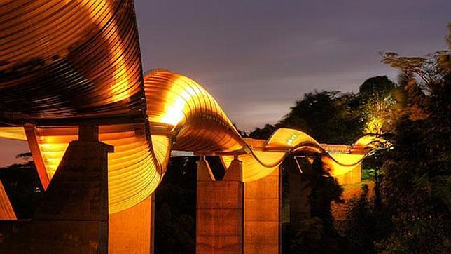Otro de los puentes más bonitos y singulares del mundo también nos lleva a Singapur. Al igual que el puente Helix es peatonal pero éste tiene forma de serpiente y es el más alto de la ciudad. Su altura y su forma ondulada lo convierte en un puente único en el mundo con siete curvas de acero que significan el esqueleto de la serpiente aunque recibe su nombre por la semejanza de su forma con una ola.