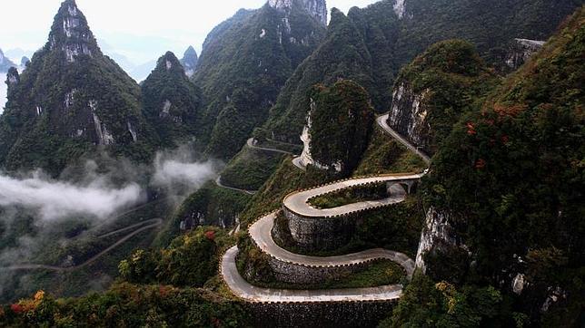 El Monte Tianmen es una montaña situada en Tianmen Mountain National Park, Zhangjiajie, en el noroeste de la provincia de Hunan, China. Para llegar a lo más alto hay un teleférico construido desde la cercana estación de tren de Zhangjiajie a la cima. Dicen que es el más largo de los instalados en las altas montañas del mundo. Lo que nos ocupa en esta ocasión es la carretera, verdaderamente espectacular. Son 11 kilómetros y 99 curvas. Y, al final de ese camino, la cueva de Tianmen, un agujero natural en la montaña de 131,5 metros; y, por supuesto, el templo, perteneciente a la dinastía Tang. Recordemos también que las montañas de Hunan sirvieron de inspiración a las que aparecen en la película Avatar. El conjunto es difícilmente igualable.