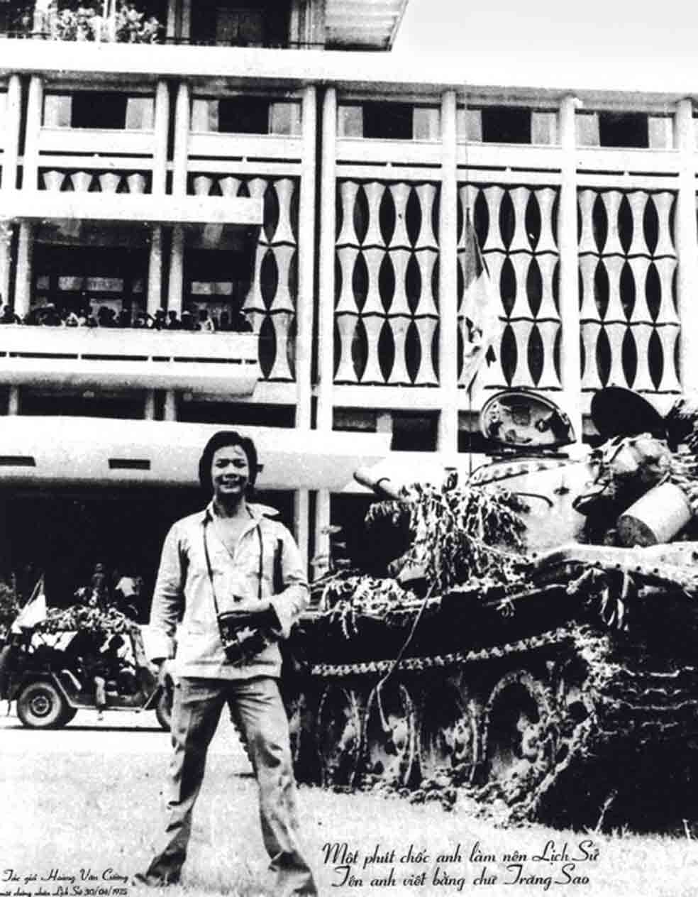 30 de abril de 1975. Cuong posa junto a un tanque norvietnamita apostado ante el Palacio Presidencial de Saigón. Era el final de la guerra. Fue él quien guio al tanque hasta el palacio. Esta imagen, sin Cuong delante, aparece en la mayoría de los libros de texto de la actual República Socialista de Vietnam.