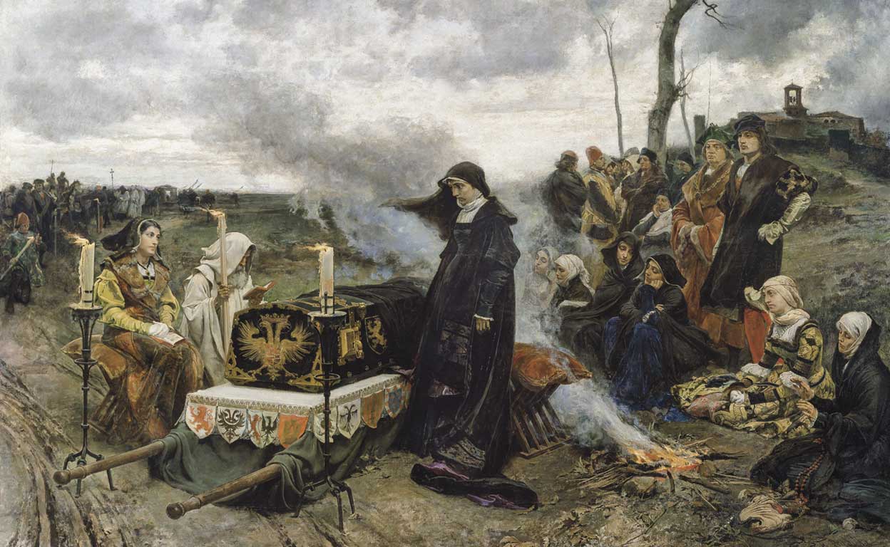 El cuadro que mejor representa el peregrinar de Juana con el cadáver de su marido es el que pintó Francisco Pradilla en 1877. El artista tenía los 29 años y enseguida alcanzó fama internacional. Era un maestro de la pintura histórica, muy interesado en el periodo que abarca desde finales del siglo XV y el comienzo del XVI. Y en él se pueden apreciar los detalles de la tragedia de Juana de Castilla.