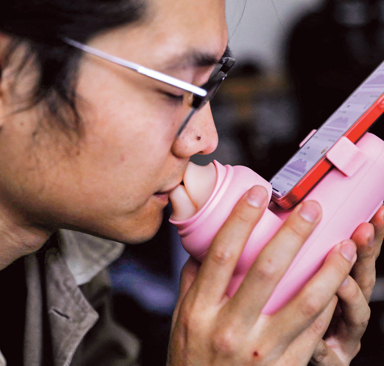 Y para añadir más veracidad, el dispositivo incluye un soporte en el que puedes colocar tu propio teléfono de modo que, a través de la pantalla, puedas mirar a los ojos al otro mientras te besas.