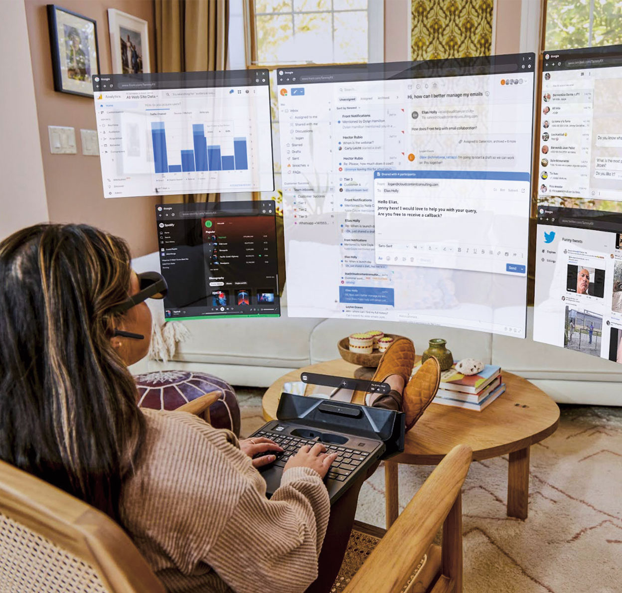 Presentan un ordenador con unas gafas que permiten desplegar una pantalla gigante y varias ventanas en cualquier sitio, lo que facilitará el teletrabajo. Un dispositivo en la misma línea de lo que augura el Vision Pro de Apple, que se comercializará el año que viene.