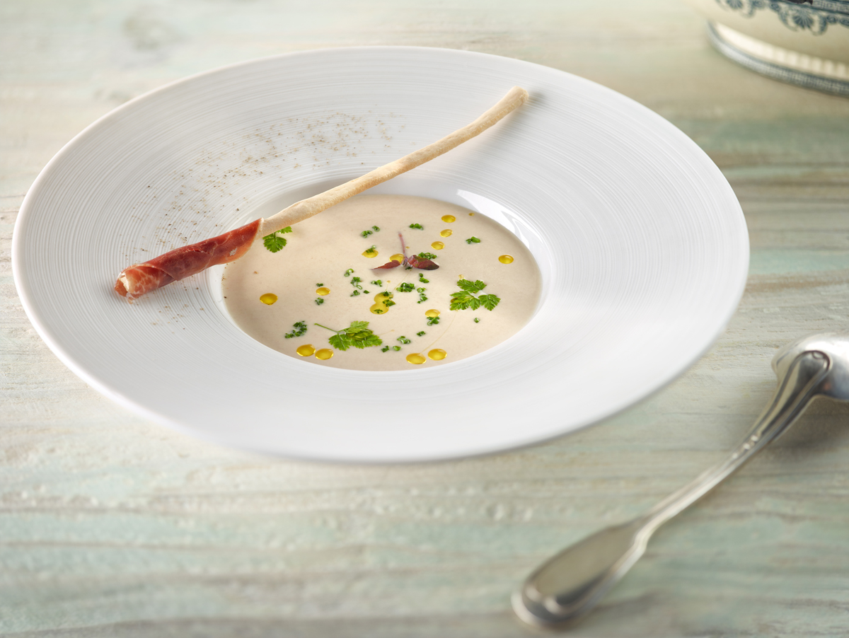 4. Rectificamos la sazón, agregamos un hilo de aceite de oliva virgen extra. Acompañamos la sopa, según nuestro gusto, con unas flautas o grisines, unas lonchas finas de buen jamón ibérico y decoramos el plato, antes de llevarlo a la mesa, con unas cuantas hojas de perifollo.