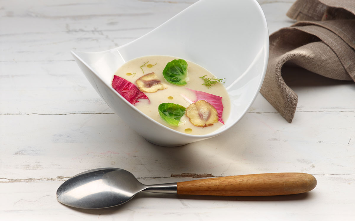 4. Acabado: bajo el grifo de agua, con una pizca de vinagre, lavamos las hojas de endibia y las escurrimos. Deshojamos luego las ramas de eneldo en pequeños ramilletes. Con una pequeña mandolina afilada fileteamos las castañas crudas en láminas muy delgadas, que nos servirán como guarnición. Metemos las hojas de col de Bruselas crudas en un baño hirviendo de agua y sal y las escurrimos rápidamente a un pequeño bol con agua, sal y hielos, para detener la cocción, fijarles el color verde y que queden así bien crocantes. Servimos la crema muy caliente con la guarnición de endibias, láminas de castaña y hojas de col de Bruselas, esparciendo los tallos de eneldo deshojado. Regamos con unas gotas de aceite de nuez y ¡listo!