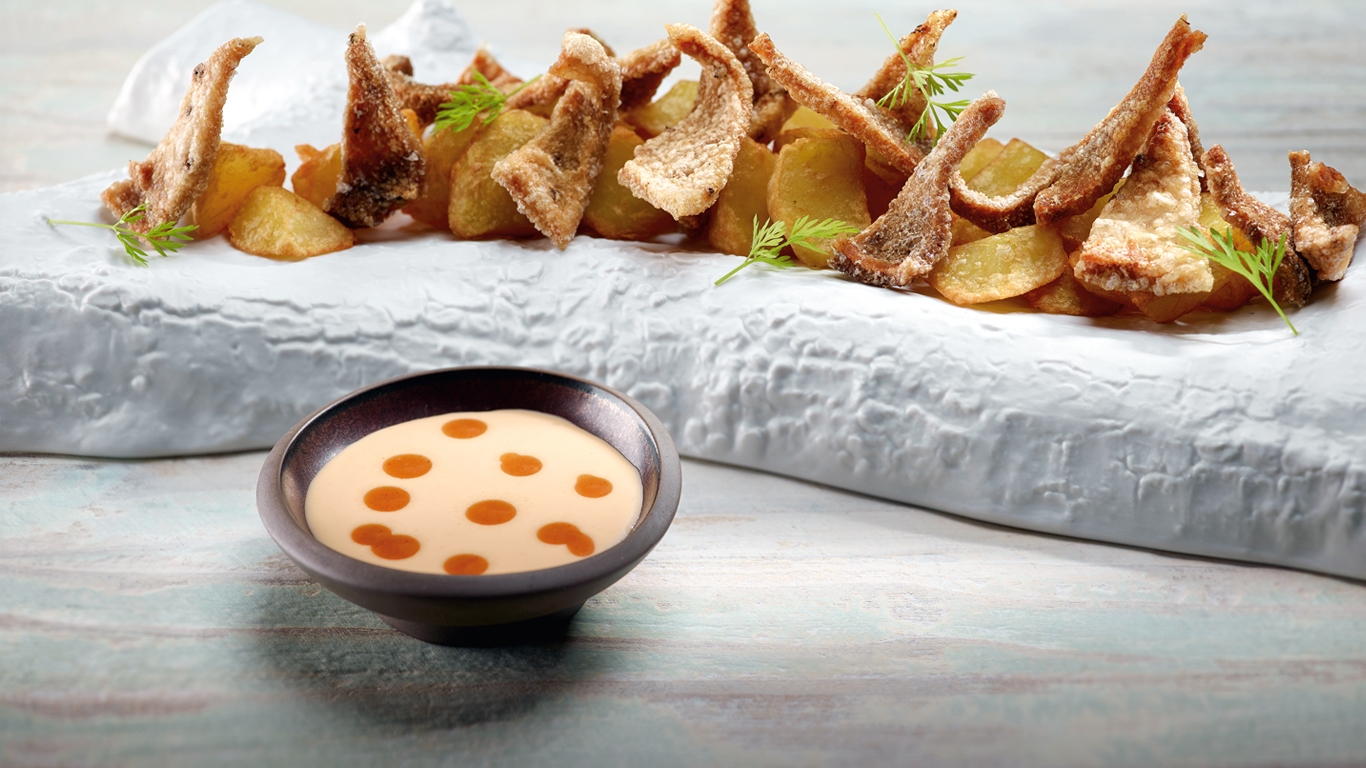 Se fríen las patatas en dos cocciones. primero, a fuego suave y, justo al final, a fuego elevado. Se fríen después las orejas y se sirven con las patatas y la salsa.