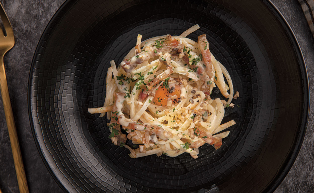 Acabado y presentación: Recalienta los espaguetis de apionabo dentro de la crema de tocineta dándole un calentón suave, sin agresividad. Disponlos en cuatro platos formando un nido. Coloca las yemas de codorniz en el centro, reparte los hongos salteados y ralla el queso en el último momento antes de servir.