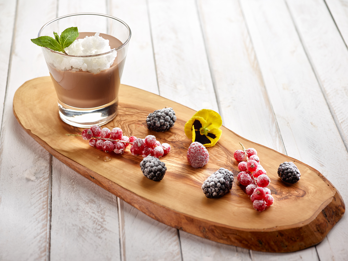 Se coloca el granizado sobre la copa de chocolate y se acompaña con las frutas rojas escarchadas