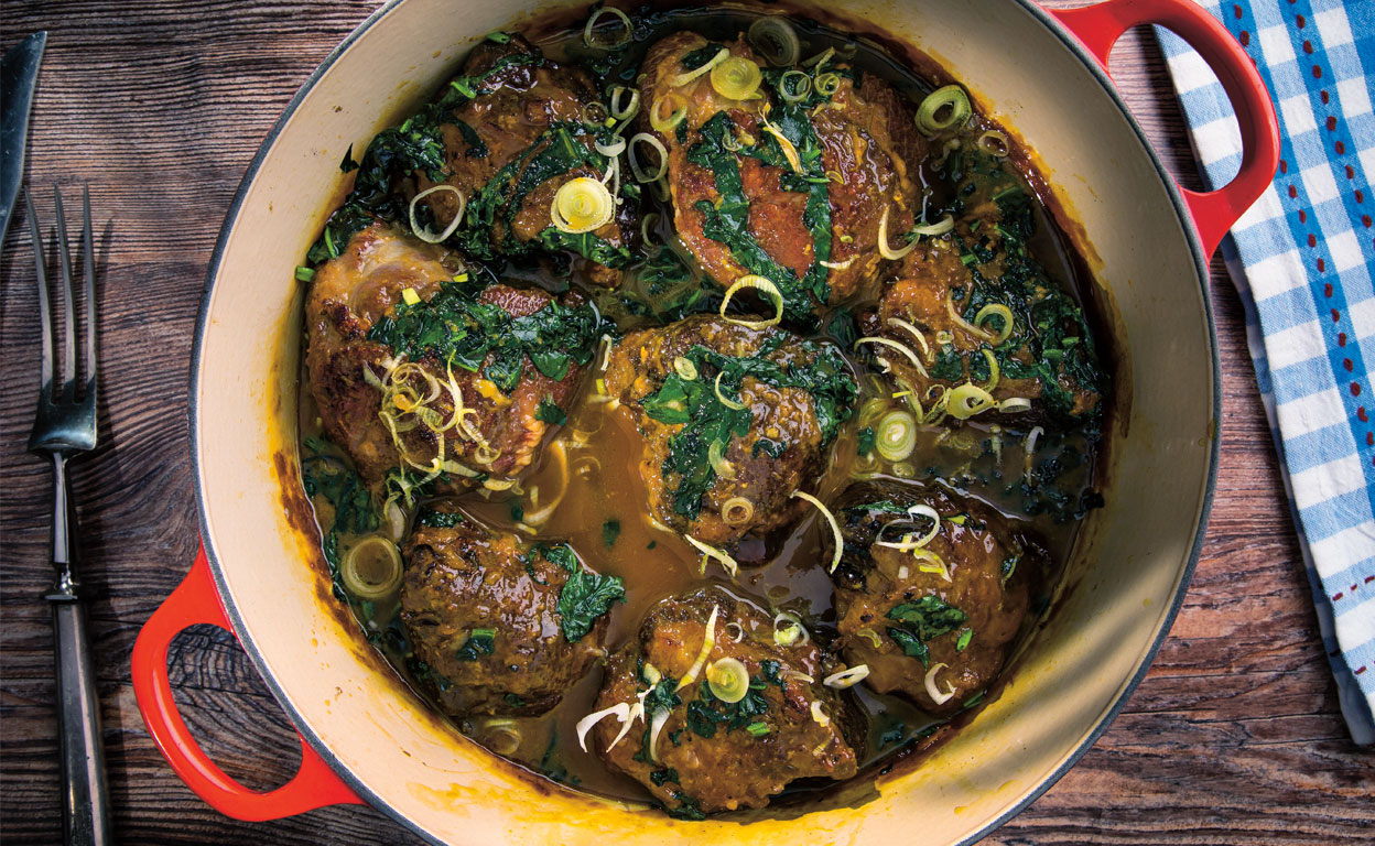 Acabado: antes de servir, retira la gasa con la piel de limón y rectifica la sazón. Puedes servirlas tal cual o pasar la salsa a través de un fino o batirla en el vaso de la túrmix para que quede más fina. Como guarnición, saltea rápidamente en una sartén bien caliente las espinacas crudas lavadas con la mantequilla hasta que se entreguen al fondo, sin pasarlas de punto. Pica las cebolletas verdes tiernas en tiras al bies y espárcelas sobre el estofado.