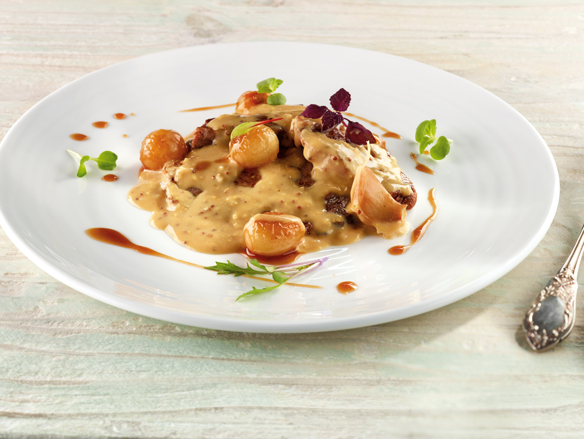 4. Escurrimos y metemos los escalopines en la salsa de mostaza. Ligamos para terminar la salsa con la mostaza en grano y la nata montada. Rectificamos la sazón, colocamos por encima las cebollitas glaseadas y ¡listo!
