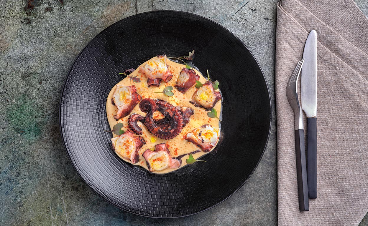 Acabado: dispón la crema de patata en el fondo de un plato y tapiza la superficie con el pulpo laminado. Echa un chorrito de AOVE y espolvorea una pizca de pimentón de la Vera.