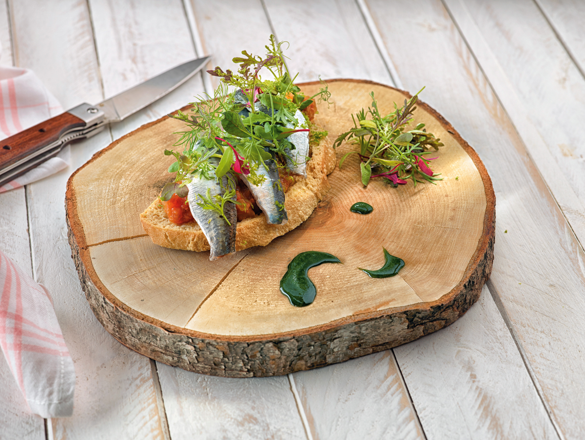 4. Se añade a la compota fría de tomate un golpe de almíbar de albahaca, se mezcla y rectifica el sazonamiento. Se pringan los panes con aceite de oliva y se colocan en una fuente. Se reparte sobre ellos la compota de tomate con albahaca. Se acomodan las sardinas y se aliñan los brotes con vinagre, aceite y sal y se colocan sobre cada tostada, rematando con unas gotas de almíbar de albahaca.
