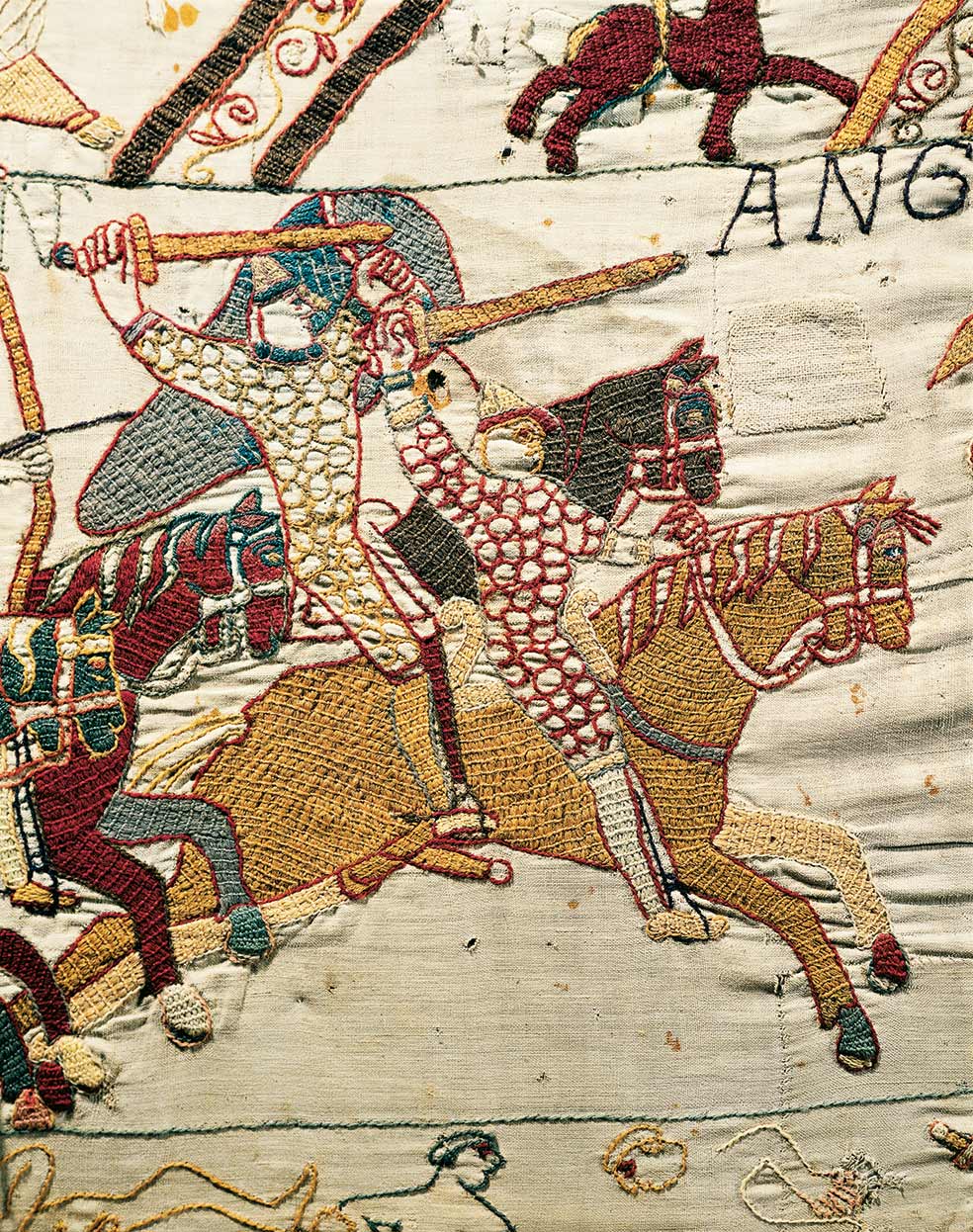 El tapiz de Bayeux, del siglo XI, es un importante documento histórico. Este gran lienzo bordado narra los hechos previos a la conquista de Inglaterra liderada por el monarca normando  Guillermo el Conquistador y que culminó en la batalla de Hastings, en 1066 y la victoria del candidato normando al trono de Inglaterra y la derrota de su oponente, el anglosajón Harold.