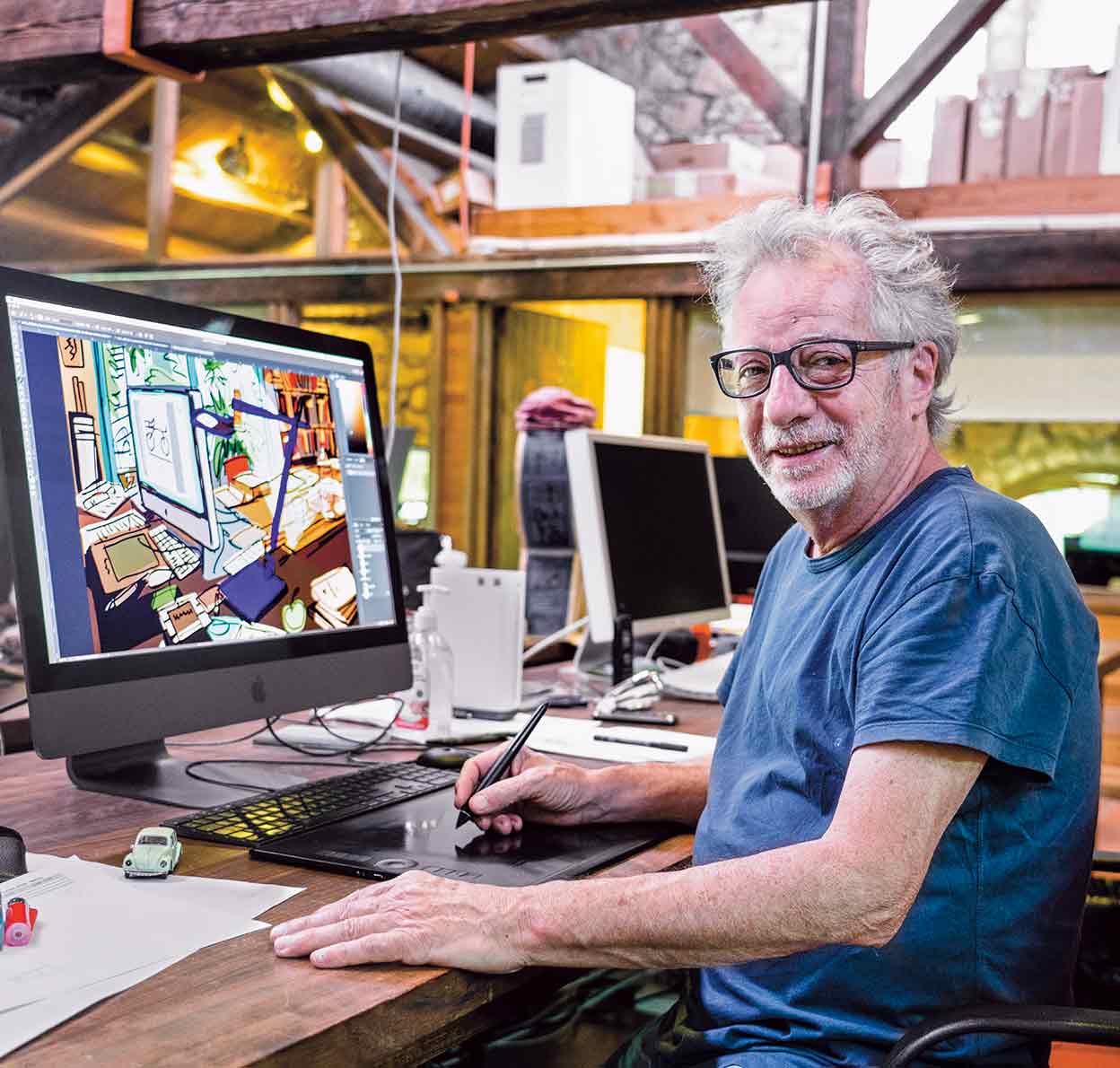 Nos recibe en su nuevo estudio, más pequeño que en el que habitó en sus mejores tiempos, pero también en Poble Nou, donde comenzó su andadura hace casi cuatro décadas. Un oasis de creación donde ha realizado en exclusiva para XLSemanal el dibujo que protagoniza nuestra portada.