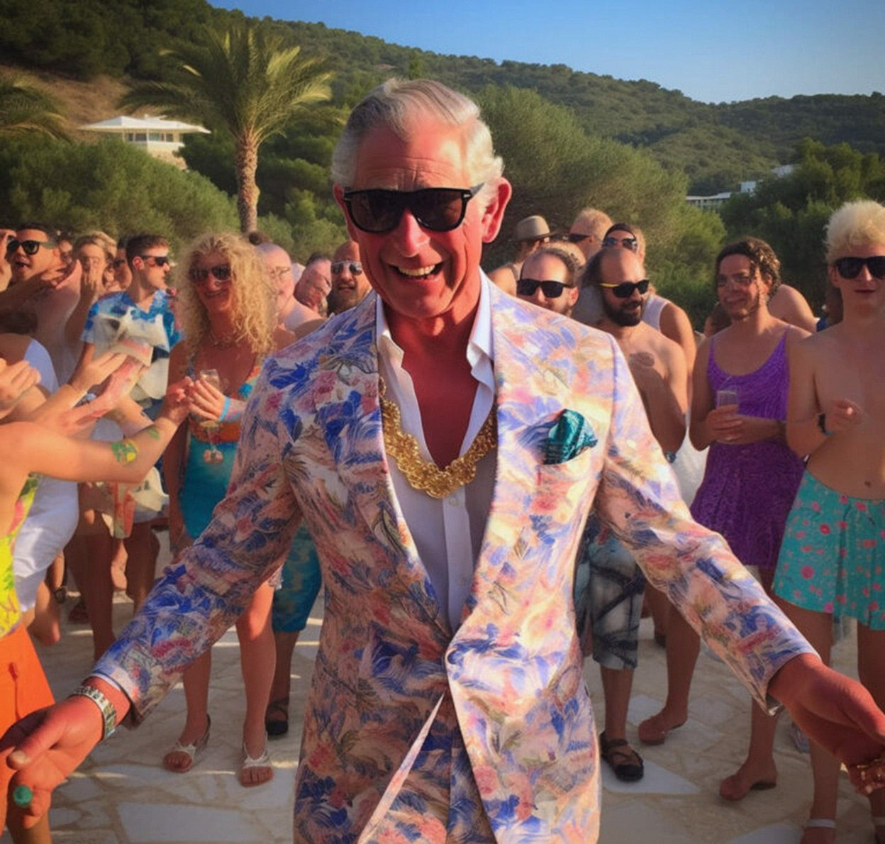 Tras la solemnidad de la abadía de Westminster y las capas de armiño, de pronto... ropas coloridas, actuaciones desinhibidas y bailes locos. Es la fiesta poscoronación imaginada por diversos artistas digitales que, con los nuevos generadores de imágenes de inteligencia artificial a su disposición, no han resistido la tentación... Así imaginan, por ejemplo, al rey Carlos III, dándolo todo a lo Travolta.