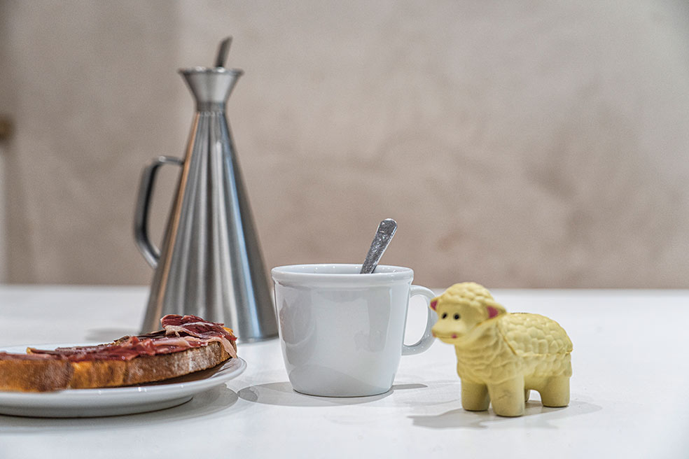 «Café con leche de oveja y una rebanada tostada de pan gallego con aceite de oliva virgen a la que, a veces, le pongo unas lonchas de jamón».
